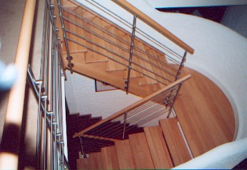 kombinierte Holzwangentreppe, Stufen wandseitig eingestemmt, auf Freiwange aufgesattelt, mit Edelstahlgeländer aus parallelen Edelstahlgurten und rundem Holzhandlauf