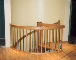 - Steiggeländer aus senkrechten Messingstäben ø 15 mm und aufgesetztem Holzhandlauf 120/40 mm