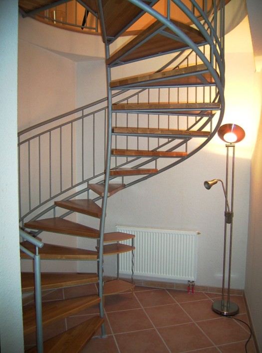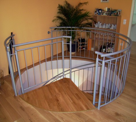 Tragwerktreppe Helix II Stufen Eiche massiv parkettverleimt, kindersicheres Geländer mit senkrechten Geländerstäben