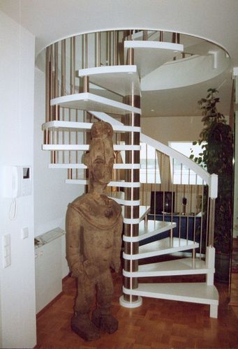 mit Edelstahlmantel und riegelverleimten weiß lackierten Massivholzstufen,