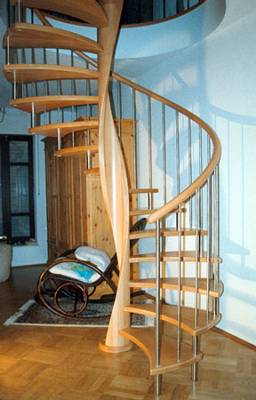 Die Treppenspindel besteht aus Holz und kann mit Edelstahl ummantelt sein.