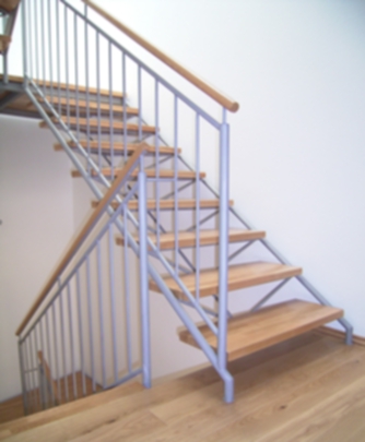 Stufenträger aus Raumtragwerk aus Stahlrundstäben mit aufliegenden Massivholzstufen, Steiggeländer aus Stahlrohr und mitlaufenden Stahlstäben. Aufgesetzter runde Holzhandlauf aus Buche mit ca. 45 mm Durchmesser. Die Stahlkonstruktion wird grundiert geliefert, die Stufen und der Handlauf sind fertig versiegelt. Bei dieser Konstruktion sind nur gerade Läufe mit oder ohne Zwischenpodest möglich.